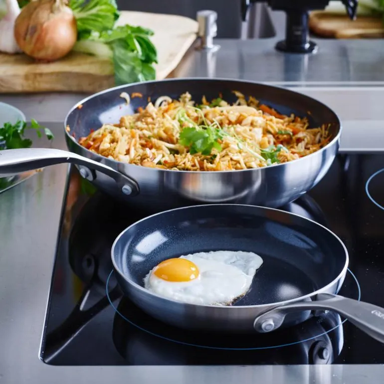 GreenPans Geneva stekepannesett kommer med to slitesterke stekepanner i rustfritt stål med keramisk belegg forsterket med diamant. Med en diameter på 20 cm og 28 cm passer disse stekepannene perfekt til alle typer koketopper, inkludert induksjonstopper.