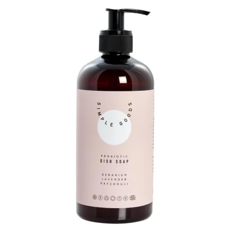 Oppvasksåpe med probiotiske bakterier og duft av geranium. Rengjøringsmiddelet inneholder ikke giftige kjemikalier og er en basert på naturlige og plantebaserte ingredienser. Den tilsatte duften kommer fra 100 % naturlige eteriske oljer.