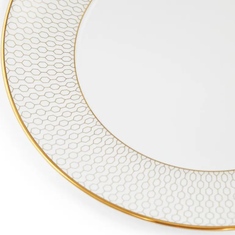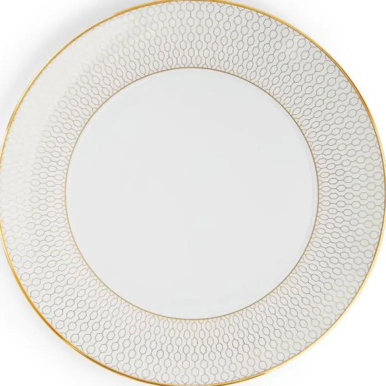 Gio Gold Plate 20cm/8in. Ved å kombinere luksus og moderne stil, representerer Wedgwoods Gio Gold-kolleksjon den perfekte blandingen av håndverk og design for det moderne hjem. Det innovative gullmønsteret gjør Gio Gold til et luksuriøst tilskudd til borddekkingen, som også enkelt kan kombineres med klassiske, hvite kolleksjoner for et mer avslappet stil. Gio Gold og Gio passer perfekt sammen. Designet for stilige kvelder, ettermiddagste og lunsjer med venner.