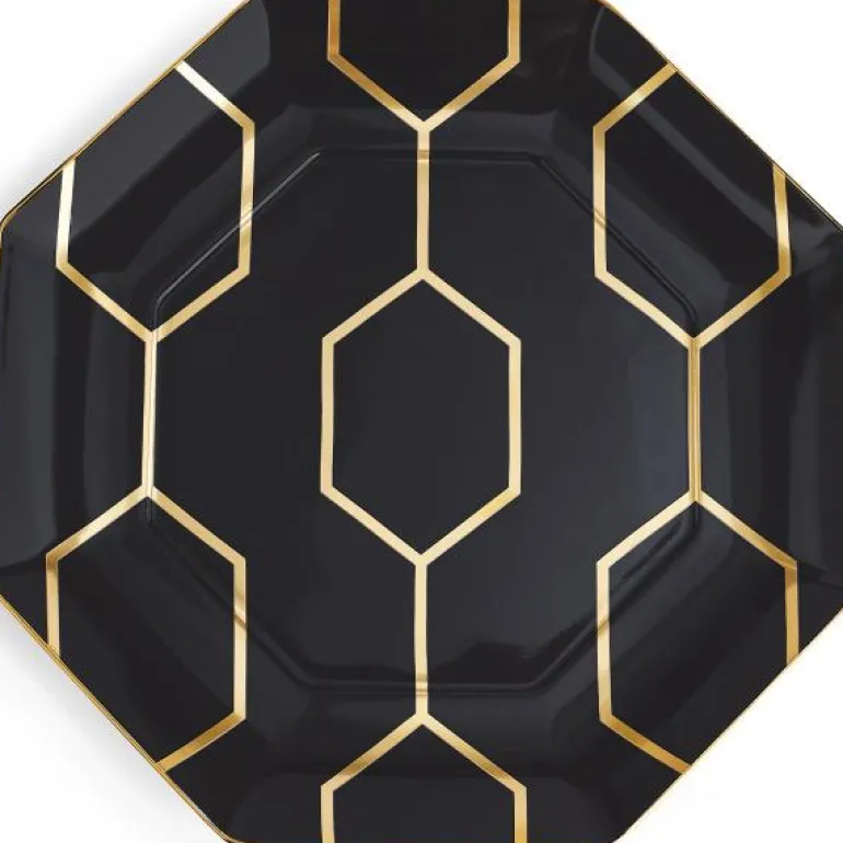 Gio Gold Plate Oct 23cm/9in Charcoal Bxd. Ved å kombinere luksus og moderne stil, representerer Wedgwoods Gio Gold-kolleksjon den perfekte blandingen av håndverk og design for det moderne hjem. Det innovative gullmønsteret gjør Gio Gold til et luksuriøst tilskudd til borddekkingen, som også enkelt kan kombineres med klassiske, hvite kolleksjoner for et mer avslappet stil. Gio Gold og Gio passer perfekt sammen. Designet for stilige kvelder, ettermiddagste og lunsjer med venner.