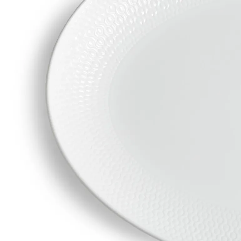 Gio Oval Platter 30cm BXD. Gio er en moderne kolleksjon med et preget design inspirert av Wedgwoods håndlagde intaglio-teknikker. Lag av keramikk er skåret gjennom for å få frem en tekstur og en taktil overflate på hver del, mens det tidløse, hvite benporselenet skaper en vakker gjennomskinnelighet. Gio er en perfekt frittstående serie i hjemmet, men kan kombineres med andre kolleksjoner som Gio Gold for et mer sofistikert uttrykk. Kolleksjonen tåler både oppvaskmaskin og mikrobølgeovn, og er designet for å brukes hver dag.