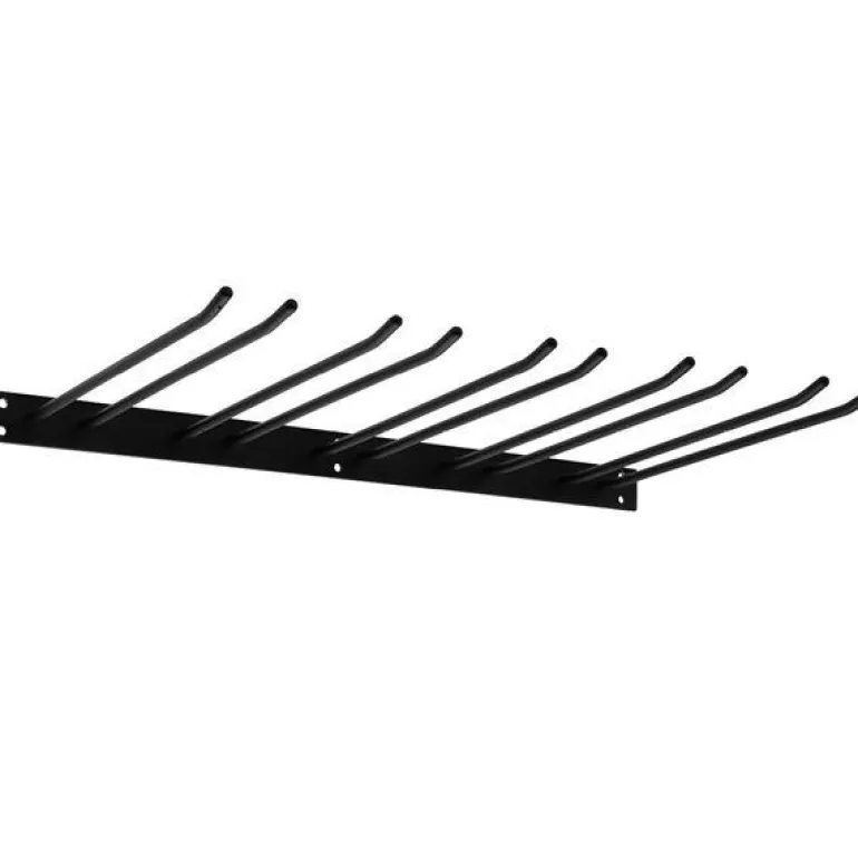 Svart glasshenger i barmodell med fem rader. Hengeren monteres på vegg, er 300 mm dyp og rommer 15 glass. Bredde 55 cm, total dybde inklusiv plate 32 cm, høyde 4 cm