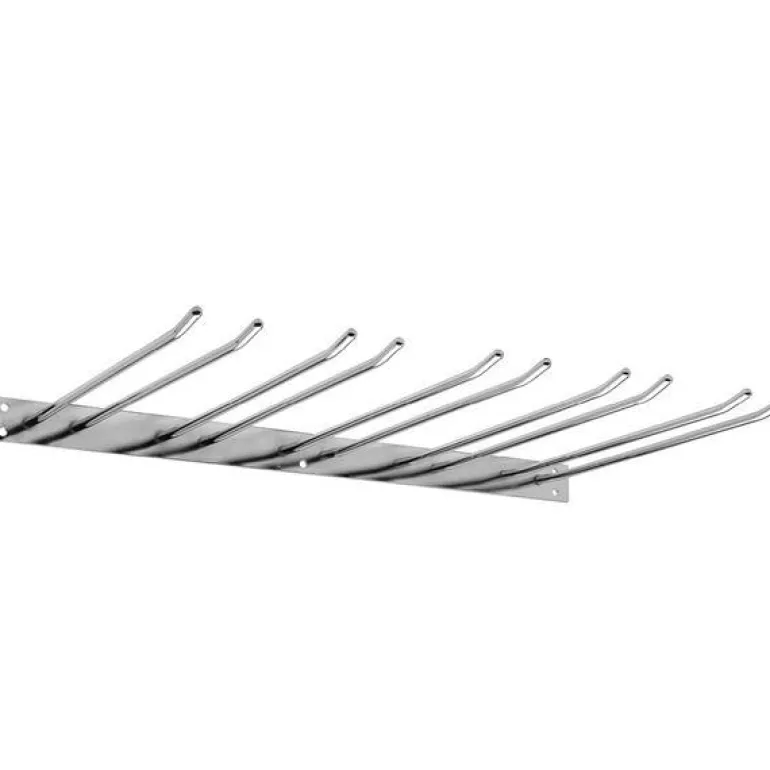 Forkrommet glasshenger i barmodell med fem rader. Hengeren monteres på vegg, er 400 mm dyp og rommer 20 glass. Bredde 55 cm, total dybde inklusiv plate 42 cm, høyde 4 cm