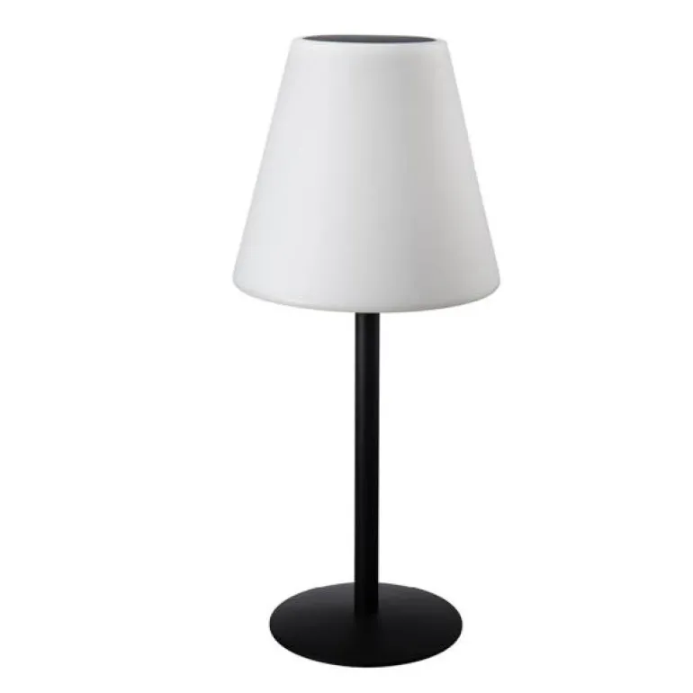 Glow bordlampe 45 cm svart/hvit, fra Stiernholm. Lampen tilbyr tre nivåer av hvitt, varmt lys, i tillegg til å kunne lyse i alle regnbuens farger, med en jevn overgang mellom fargene. Lampen kan lades med den medfølgende USB-kabelen eller via det innebygde solcellepanelet på toppen.