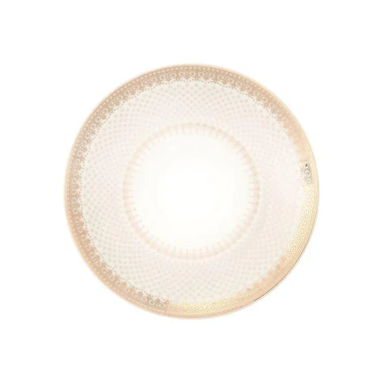 Skål til kaffekopp i den nye serien Gold Grande produsert av Royal Porcelain. Gold Grande er et allsidig og elegant servise i benporselen. Serien har tradisjonelle former med et delikate design i varme gulltoner. Kombinasjonen av matt og blank finish i glasuren gir Gold Grande et elegant uttrykk. Serviset kan vaskes i oppvaskmaskin på inntil 55 grader. Det anbefales å halvere vaskepulvermengden og å bruke glansemiddel. Med Gold Grande kan du dekke flotte bord til både høytid og fest. Serien består av 15 deler og inkluderer det du trenger til frokost, lunsj, middag og kaffe. Gold Grande er et naturlig valg på bryllupslisten.
