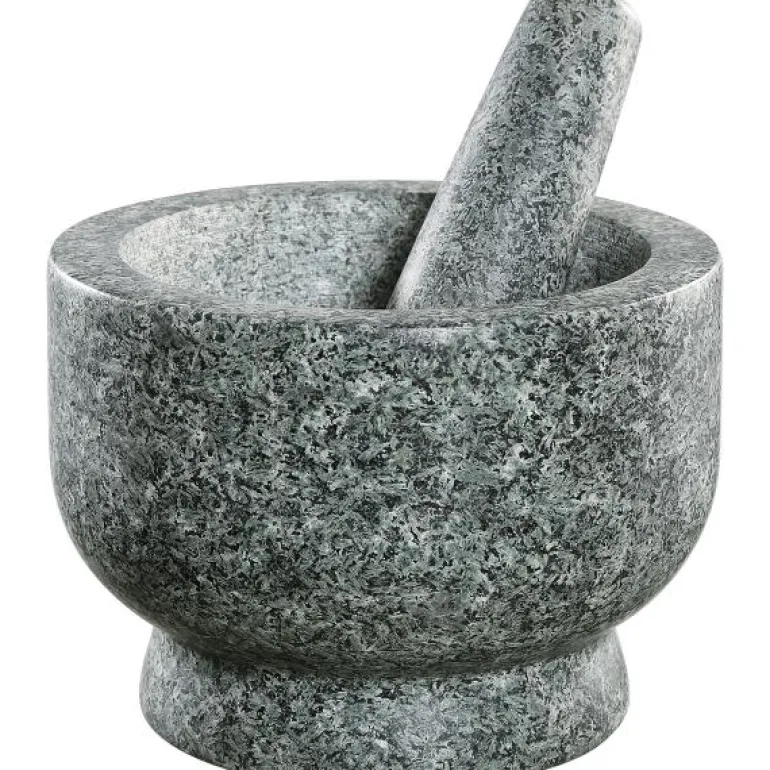 GOLIATH-mørtelen i granitt fra Cilio tjener deg godt. Hakkede urter, hvitløk, havsalt og mer er ikke noe problem. Med en diameter på 18,5 cm kan den holde en god mengde gris og dens solide vekt gjør den stabil når skyveren gjør jobben sin. Den tykkveggede granitten tåler mye – oljer og fruktsyrer vil ikke skade den.