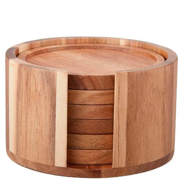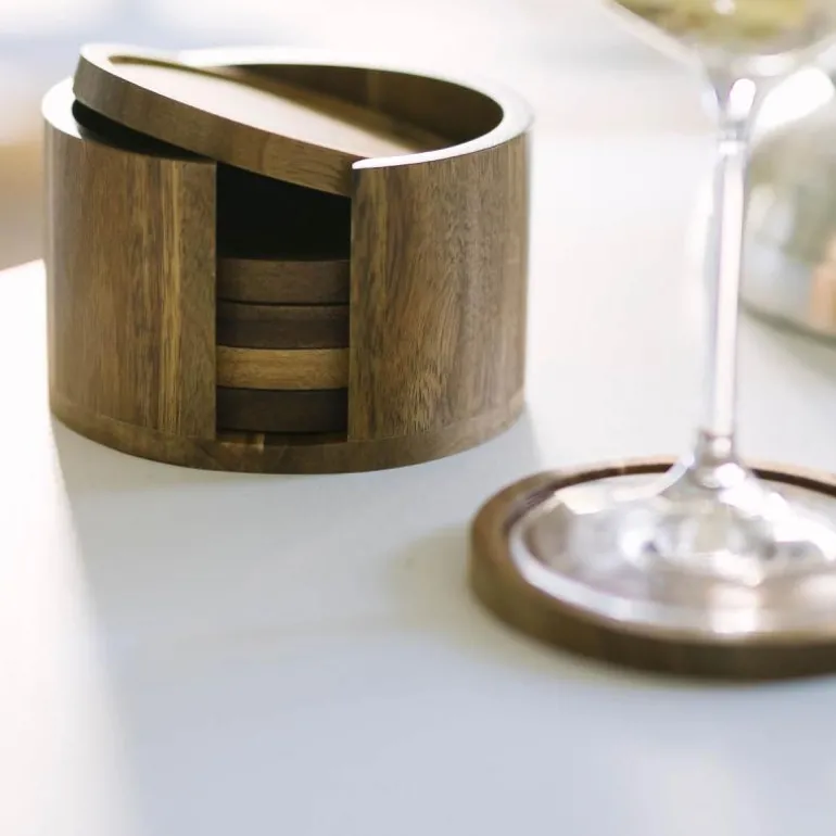 Stilige glassunderlegg i akasietre med et fleksibelt stativ i samme materiale å oppbevare dem i. Gota Glass underlegg beskytter bordet ditt mot fuktige ringer og er også et fint element i borddekkingen.