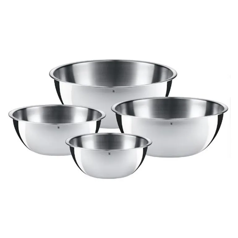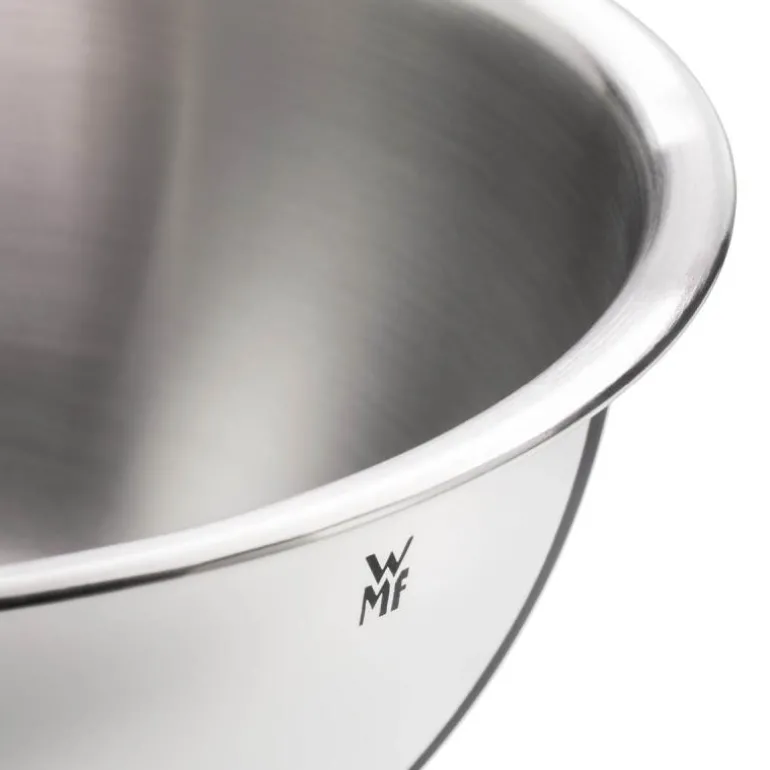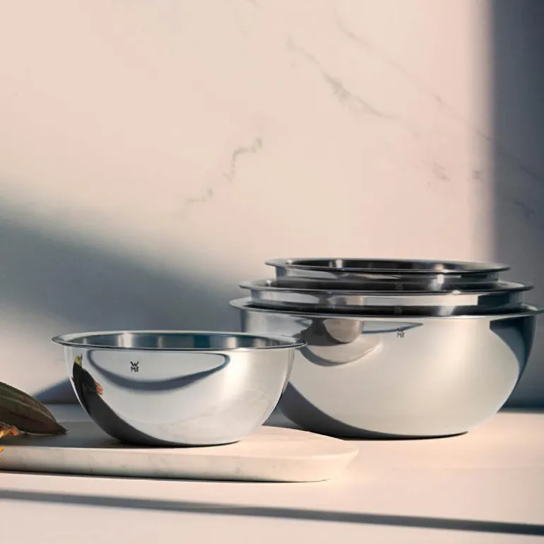WMF Gourmet kjøkkenskålsettet inneholder fire skåler i forskjellige størrelser for allsidig bruk. Bollene er perfekte å blande i under baking eller matlaging. De kan også brukes som salat eller serveringsboller. WMF kjøkkenskålene er laget av Cromargan® 18/10 rustfritt stål av høy kvalitet, noe som gjør dem ekstremt holdbare når de brukes med for eksempel en elektrisk mikser. Skålene kan vaskes i oppvaskmaskin, noe som gjør dem svært hygieniske. De kan også stables oppå hverandre for oppbevaring.