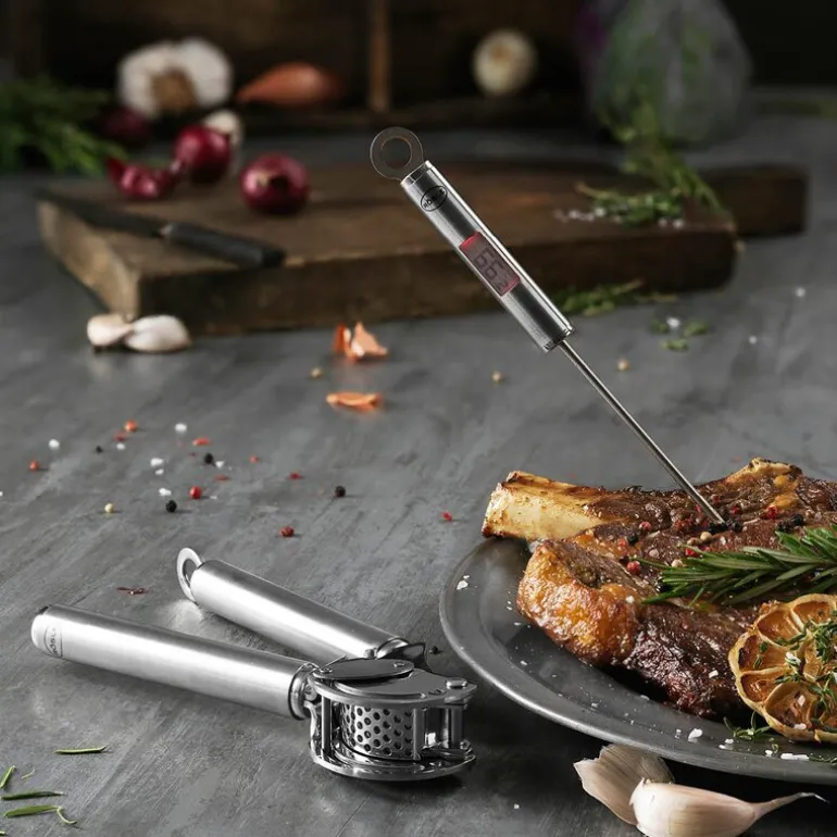 RÖSLE gourmet instant termometer på 22 cm i stål er et digitalt termometer som gir presise temperaturmålinger fra -40 °C til +200 °C, og er et allsidig verktøy for alt fra steker og babymat til vin og te.