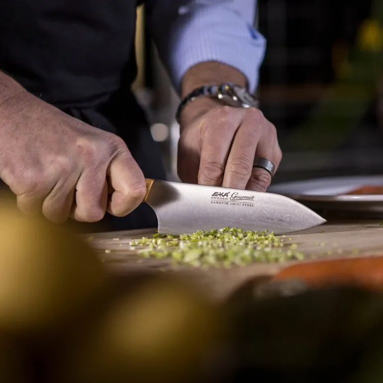 EKA Gourmet kokkekniv 20 cm tre er en uunnværlig del av ethvert kjøkken, perfekt for både hverdagskokker og profesjonelle. Denne klassiske kokkekniven er utformet for å håndtere et bredt spekter av oppgaver, fra å skjære og kutte i terninger til å hakke grønnsaker og dele kjøtt, fisk og fjærkre.