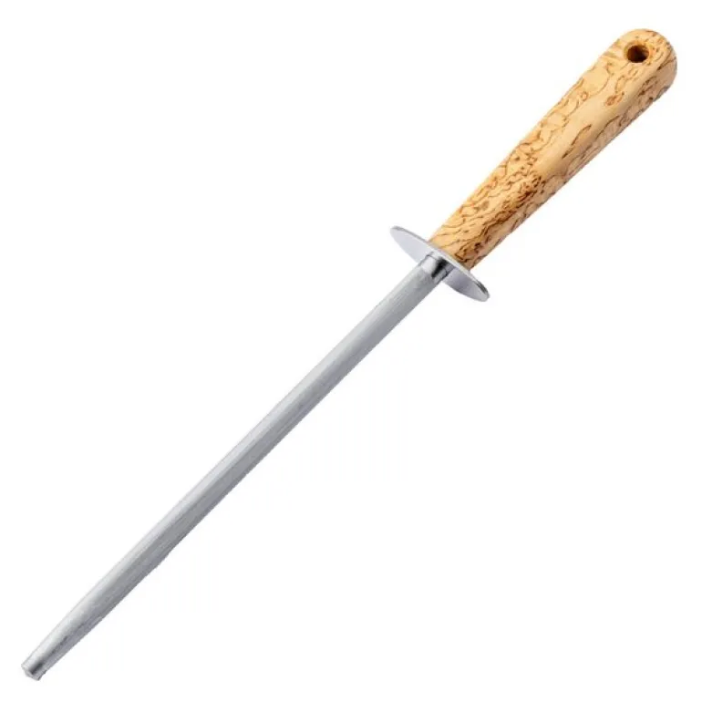 Håndtaket er laget i Eskilstuna, Sverige, av nøye utvalgt Masurbjørk, og forsterket med elegante messingskruer som både gir et komfortabelt grep og et eksklusivt utseende. Dette slipestålet er ikke bare et verktøy, men også en vakker detalj som tilfører kjøkkenet ditt et snev av skandinavisk design.