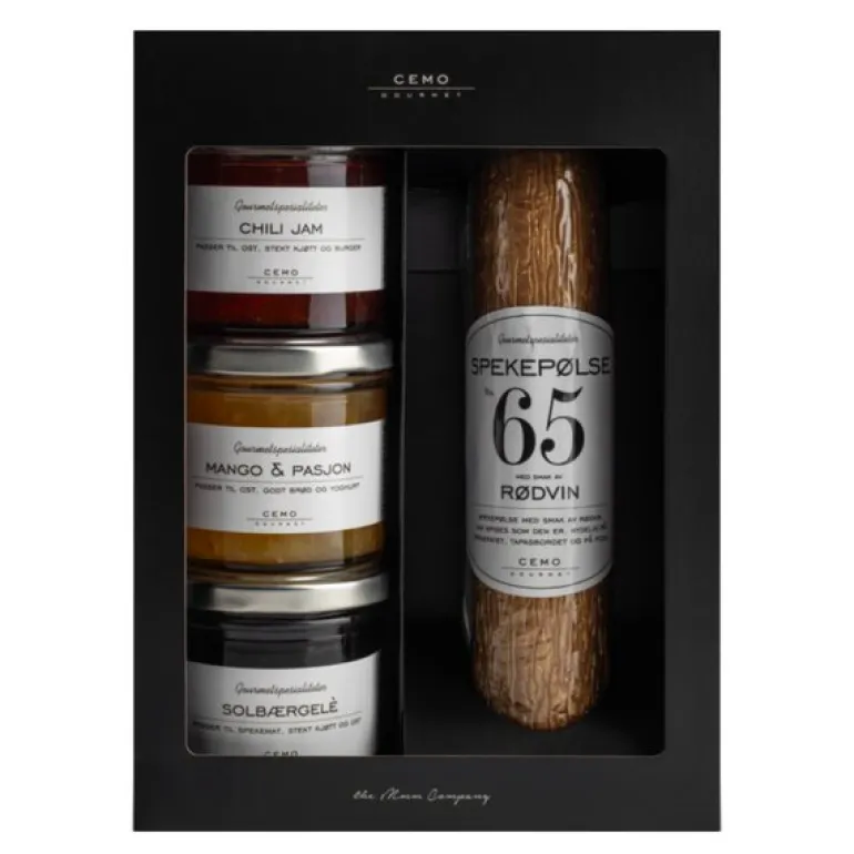 Gourmet spekesnacks fra Cemo. Spekesnacks er perfekt for matelskere som setter pris på kvalitet og smak. Dette settet er nøye sammensatt for å gi deg en harmonisk balanse av søtt, krydret og fruktig – passer til både hverdagskos og spesielle anledninger. Spekepølse med rødvin er norskprodusert og av ypperste kvalitet. Chilijam er en eksplosjon av smak – en perfekt blanding av sødme og varme. Den passer perfekt til alt fra oster og kjøtt. Solbærgele er er laget av solmodne solbær og har en deilig, fruktig smak. Mango og pasjon syltetøy kombinerer den søte og saftige smaken av mango med den friske syrligheten fra pasjonsfrukt. Dette syltetøyet er en fantastisk følgesvenn til både ost og desserter.