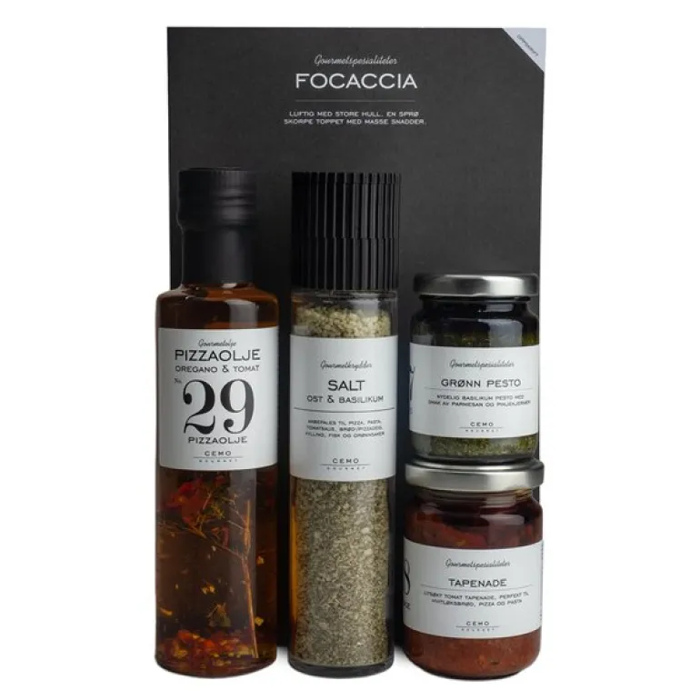 Gourmet temapose focaccia 560g fra Cemo. Focaccia smaker ekstra godt på varme dager, og vi har satt sammen den perfekte posen for å gjøre måltidet komplett! Denne pakken inneholder en nydelig tapenade og grønn pesto som du enten kan smøre på focacciaen eller dyppe den i for en ekstra smakfull opplevelse.