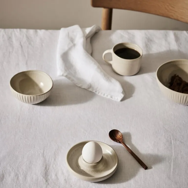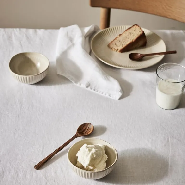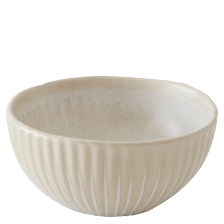Granada skål fra Tell Me More har en diameter på 11 cm og er laget i håndlaget steintøy. Den reaktive glasuren i kremfarge utvikler sitt endelige uttrykk under brenningen, noe som gir hver skål unike nyanser og naturlige variasjoner i overflaten.