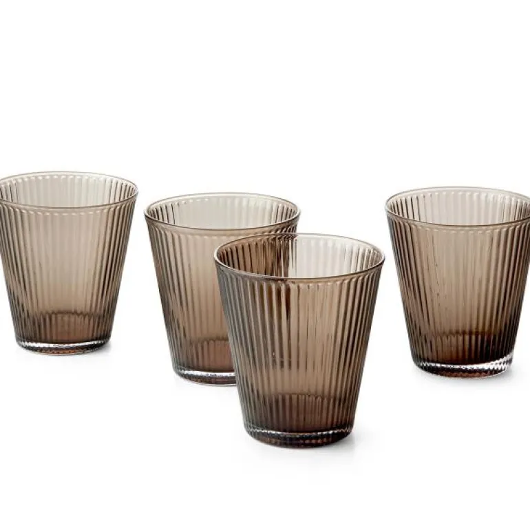 Fire stykk vannglass i serien Grand Nouvaeu, fra Rosendahl. Vannglassene rommer 26 cl, og er i fargen valnøtt.