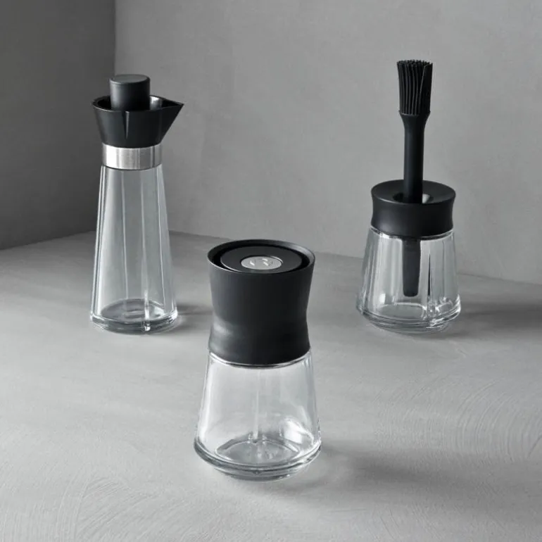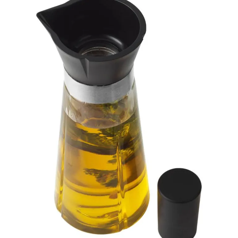 Den enkle glassflasken er velegnet til både olje og eddik, og gjør doseringen på salaten eller i matlagingen enkel. Den praktiske skjenkeproppen settes i flasken, og proppens tilbakeløp sikrer at innholdet ikke drypper eller renner ned langs siden på flasken.