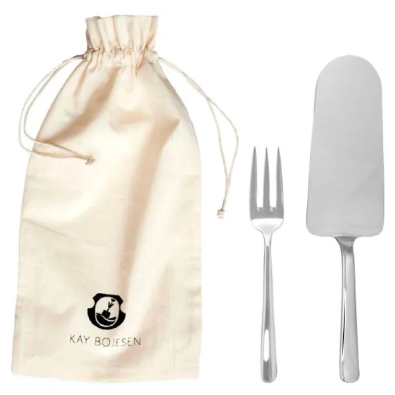 Kakesettet i polert stål består av en kakespade (22,5 cm) og fire kakegaffler (15 cm). Bestikket er designet av Kay Bojesen, og er en del av bestikkserien Grand Prix.