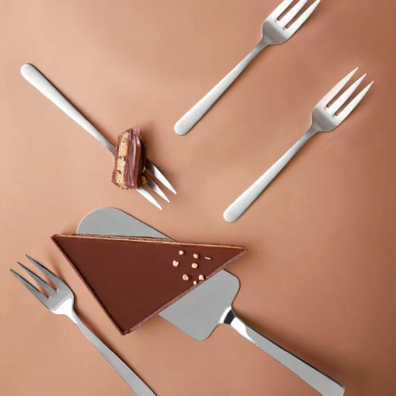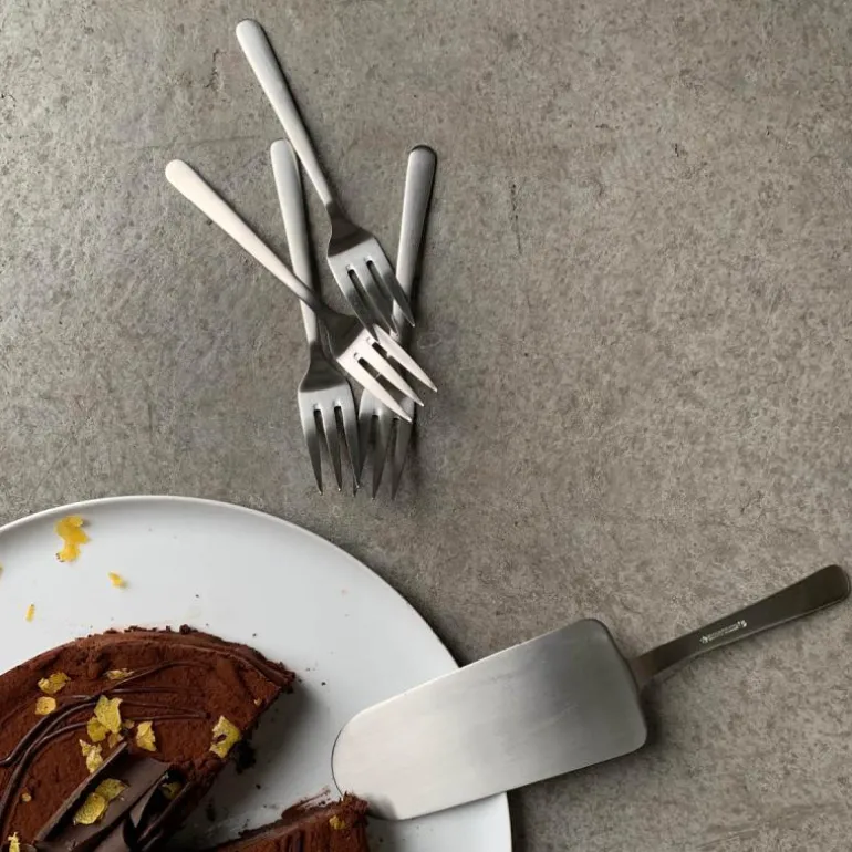 Kakesettet egner seg like godt til servering av store lagkaker, små muffins eller smørbrød. Kakespaden sørger for at kaken, stor som liten, kommer trygt fra fat til tallerken. Og utformingen av gaflene sikrer at ikke en smule går tapt.