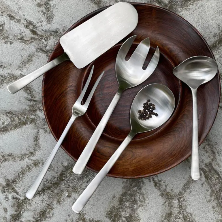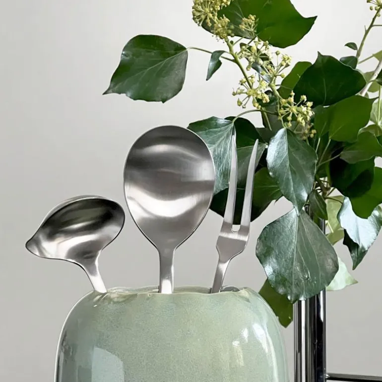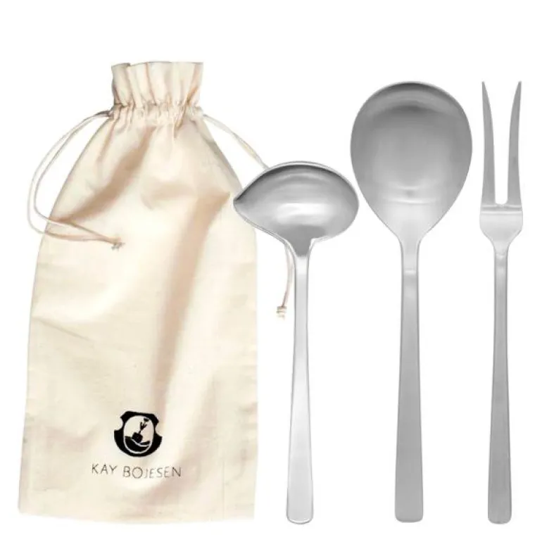 Serveringssettet består av en stekegaffel (22,5 cm), en serveringsskje (23,5 cm) og en sausskje (18,5 cm). Leveres i Kay Bojesen gavepose i 100% bomull.