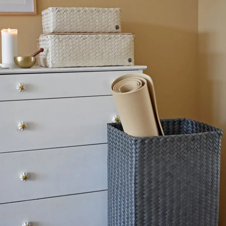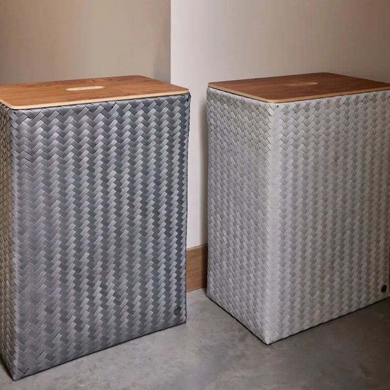 Med solid trelokk holdes innholdet skjult og kurven blir et stilfullt innslag i hjemmet. Bruk den også i gangen til paraplyer, votter og skjerf. Et tips: plasser to kurver i ulike farger ved siden av hverandre for å skille lyst og mørkt tøy.