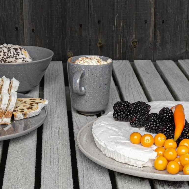 Nydelig servise i rustikt preg i glasert grå med spettete partikler . Produsert i Portugal som er kjent for sin høye ekspertise på kvalitet til det dekkede bordet.