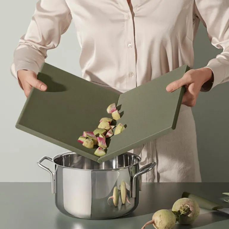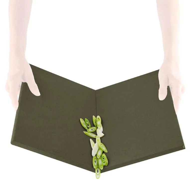 Sett sammen de to skjærebrettene. Bøy det deretter på midten, slik at det er lett å få hakkede grønnsaker over i stekepannen uten søl. Skjærebrettene oppbevares sammen eller lagt oppå hverandre, alt etter plassforholdene på kjøkkenet. Tåler oppvaskmaskin.