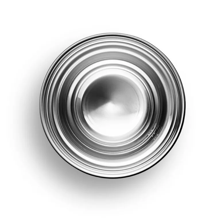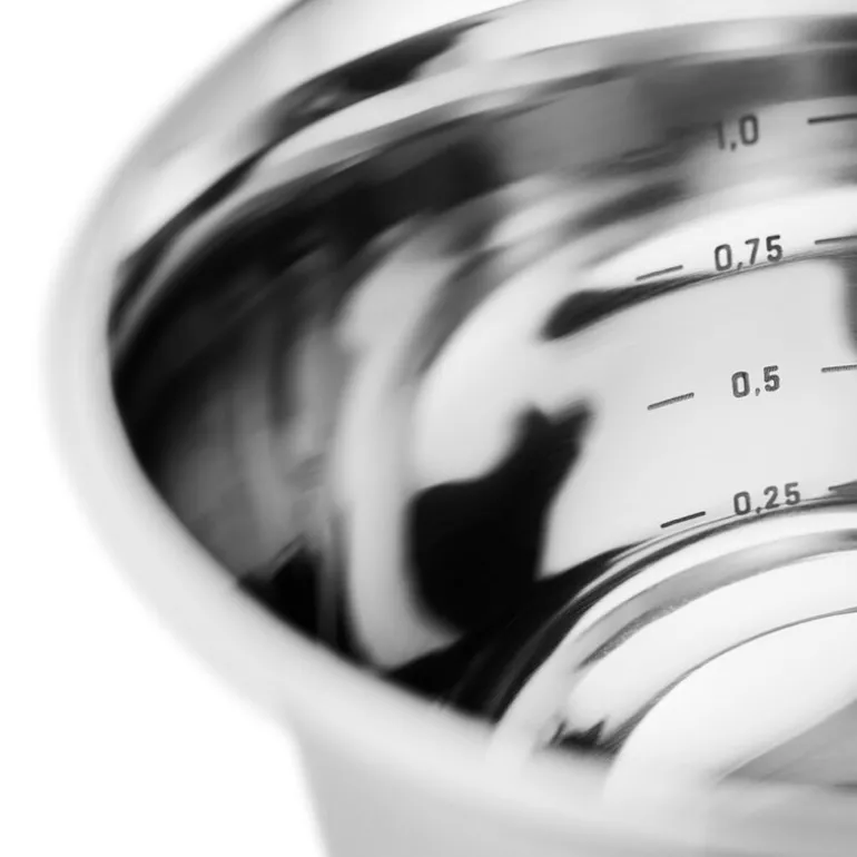 Det rustfrie stålet reagerer ikke med sure eller basiske ingredienser, noe som gjør bollen ideell for oppbevaring av mat uten risiko for påvirkning av smak eller kvalitet. Innvendige målemarkeringer forenkler oppmåling direkte i bollen, og den kan stables for å spare plass. Enkel rengjøring er sikret ved at bollen tåler oppvaskmaskin.