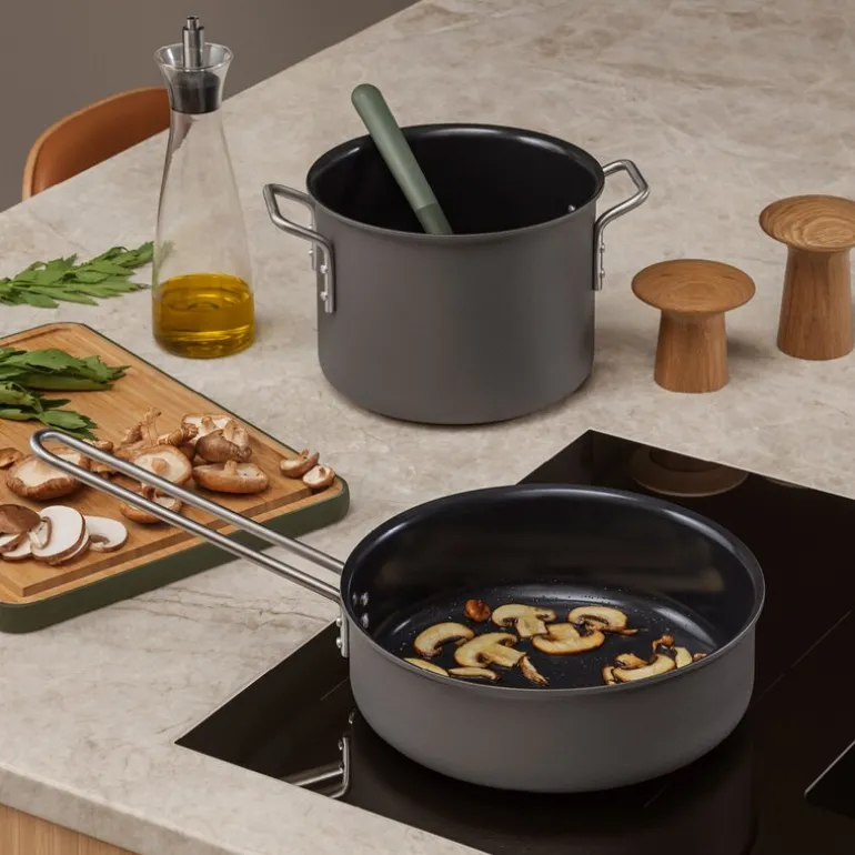 Traktørpannen er fremstilt av 100 prosent resirkulert post-consumer aluminium, som gir en lett og solid konstruksjon. Innsiden er belagt med keramisk Slip-Let®-belegg, som effektivt hindrer at mat brenner seg fast, og som gjør rengjøringen rask og enkel.