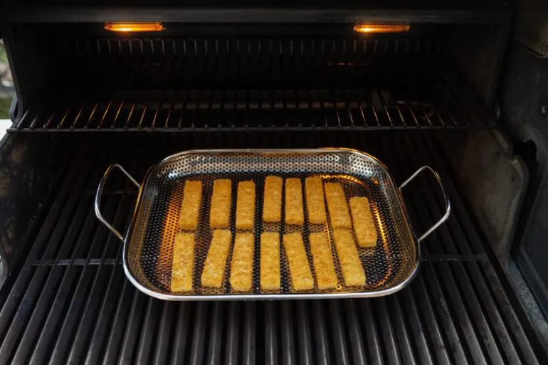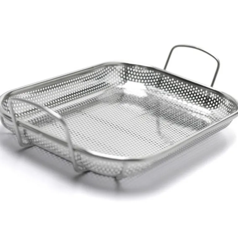 Grillform med store håndtak og en glatt overflate med små perforerte hull, alt i rustfritt stål. Den er lett å rengjøre og perfekt å grille i ettersom de små hullene forhindrer at maten faller ned i grillen. 44x28x11 cm