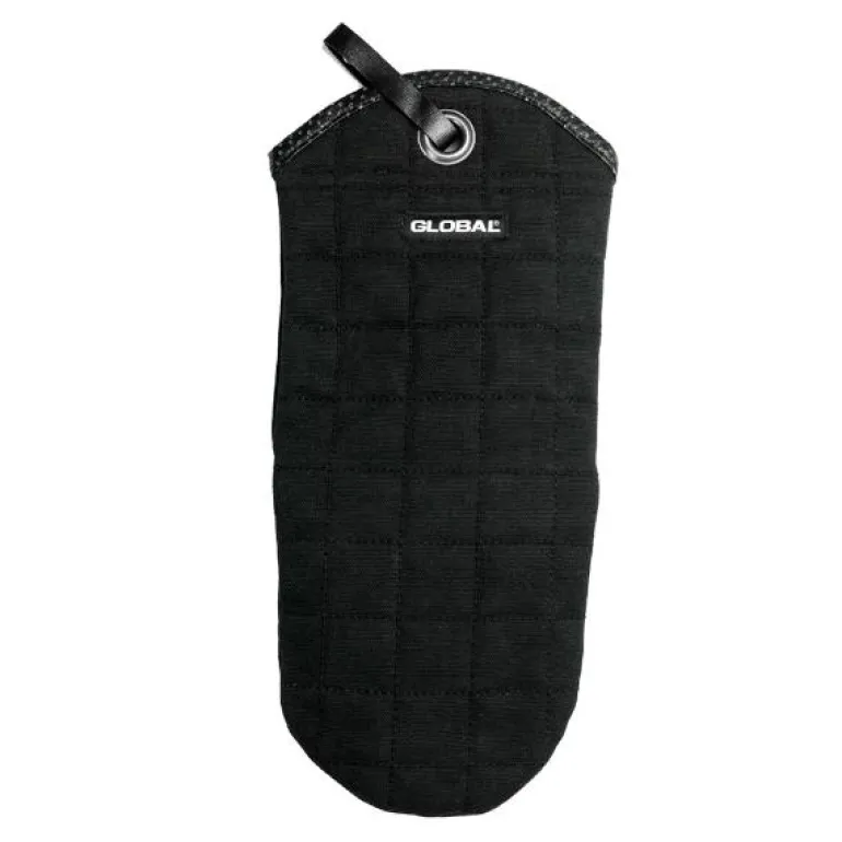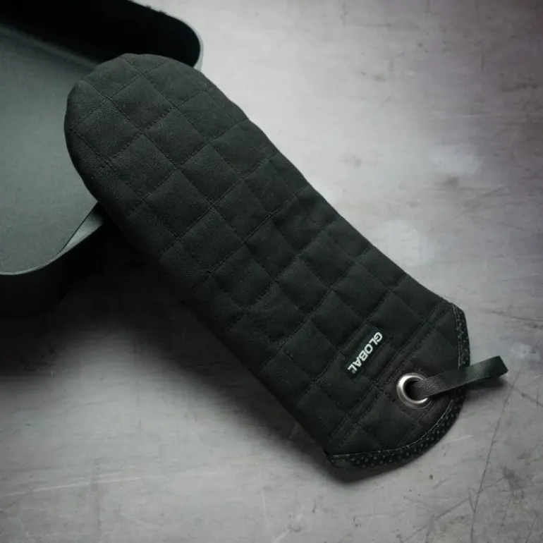 Globals grillhansker er gode å ha like ved komfyren og grillen. Grillhansken er laget av et robust lerretsstoff og har en skinnkant som er perforert med Globals klassiske prikkemønster. Den har også en praktisk hempe i matt børstet metall til å henge den opp. Kan vaskes på 60 grader.