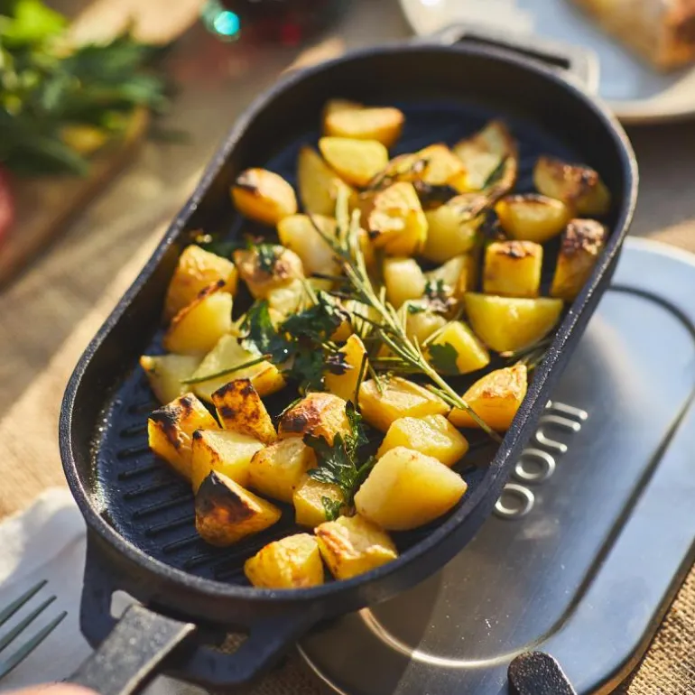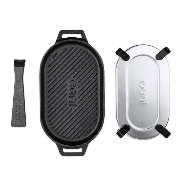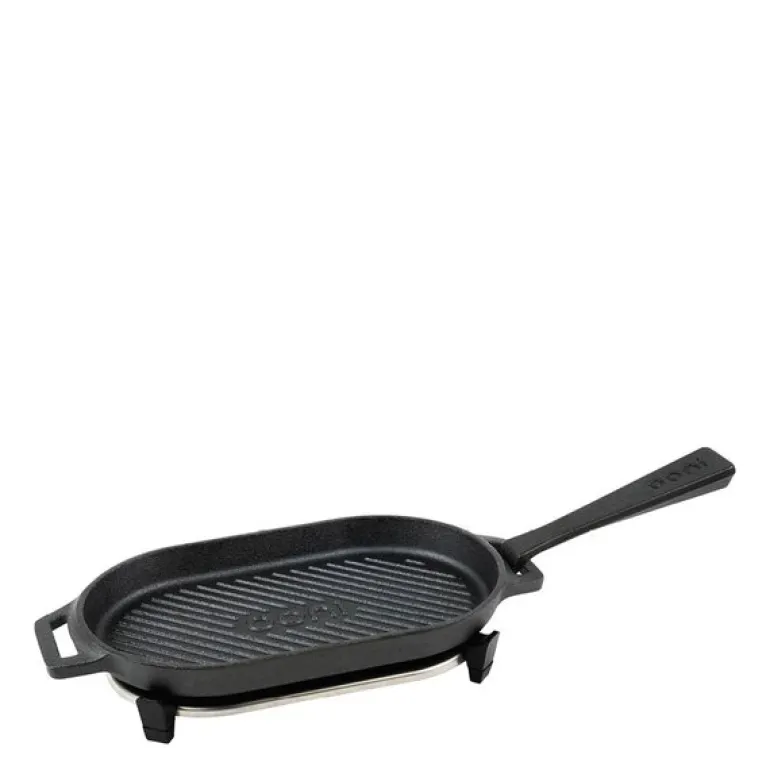 Ooni Grizzler er en grillpanne i støpejern som kombinerer egenskapene til en klassisk stekepanne med tydelige grillriller. Den er utformet for bruk i Ooni-pizzaovner og gir deg mulighet til å steke kjøtt, grønnsaker og annet med markante grillmerker og jevn varmefordeling.