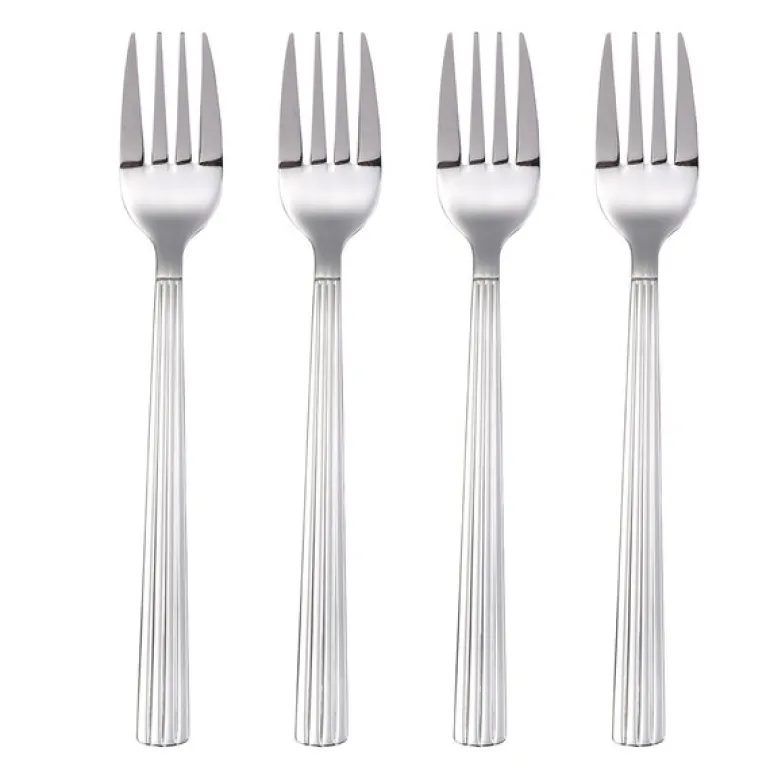 Fire stykk Groovy gaffel i polert stål fra Aida. Settet er en del av den elegante Groovy-serien, som kombinerer et klassisk formspråk med et karakteristisk, riflede design. Disse gaflene har et moderne og tidløst utseende, laget av skinnende rustfritt stål som gir både holdbarhet og en raffinert finish. De tåler oppvaskmaskin, noe som gjør dem enkle å vedlikeholde og praktiske i bruk.