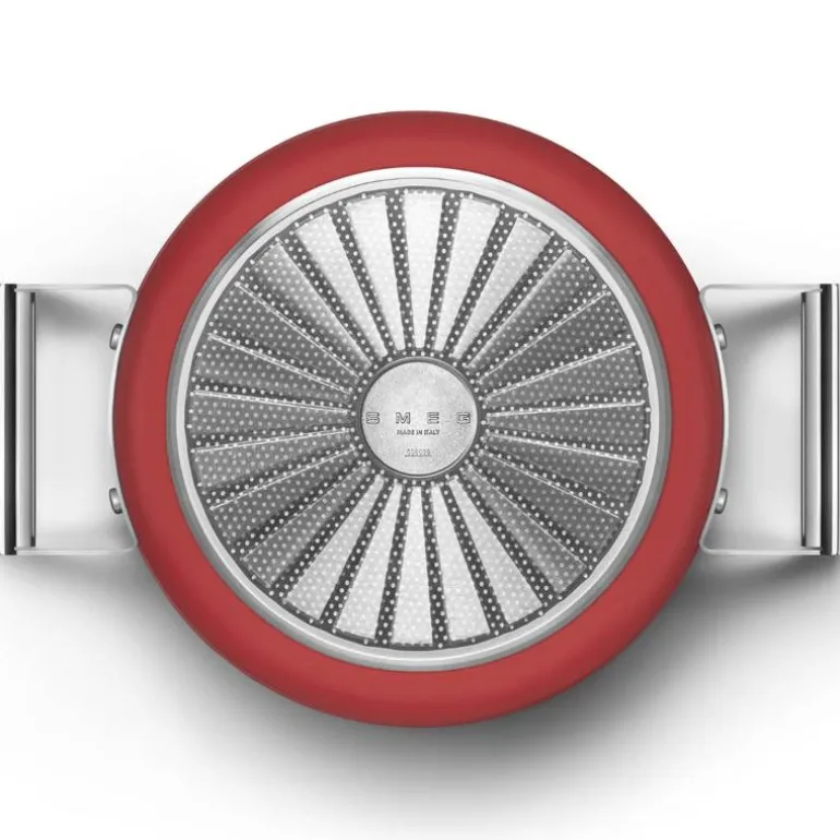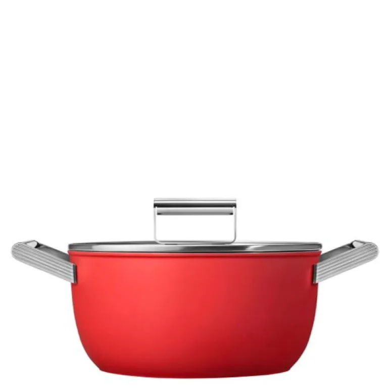Elegant gryte med lokk 4,8L i rød fra Smeg, med en diameter på 24 cm, kombinerer en aluminiumskropp og rustfri stålbunn for optimal holdbarhet og jevn varmefordeling. Med en bunn og kant på 4,5 mm sørger gryten for stabil varme, ideell for allsidig matlaging.