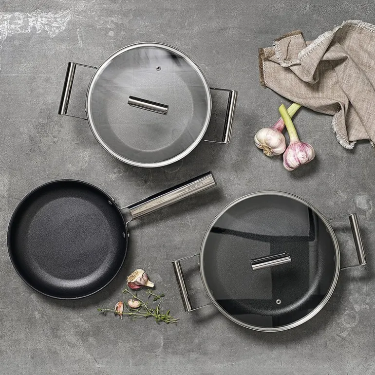 Gryten består av seks lag: en ytre bunn av rustfritt stål, aluminiums-kropp, et sandblåst lag som binder non-stick-belegget, et primerbelegg, et non-stick-lag med keramiske partikler og til slutt et PTFE non-stick toppbelegg. Denne flerlagsteknologien gir en perfekt balanse mellom funksjon og kvalitet, som gjør gryten til et pålitelig redskap på kjøkkenet.
