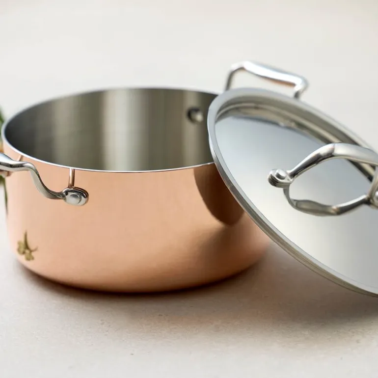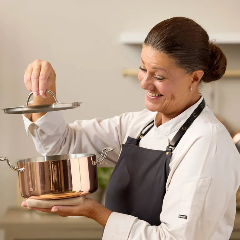 Blomsterbergs gryte i kobber og rustfritt stål med lokk rommer 3 liter og kombinerer klassisk design med praktisk funksjonalitet. Den solide aluminiumskjernen sørger for jevn varmefordeling, mens kobberet på utsiden gir gryten et elegant preg. Gryten er kompatibel med alle typer varmekilder, inkludert induksjon.