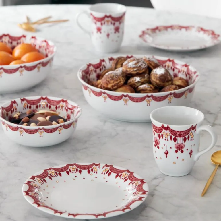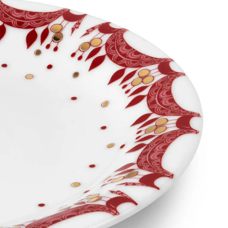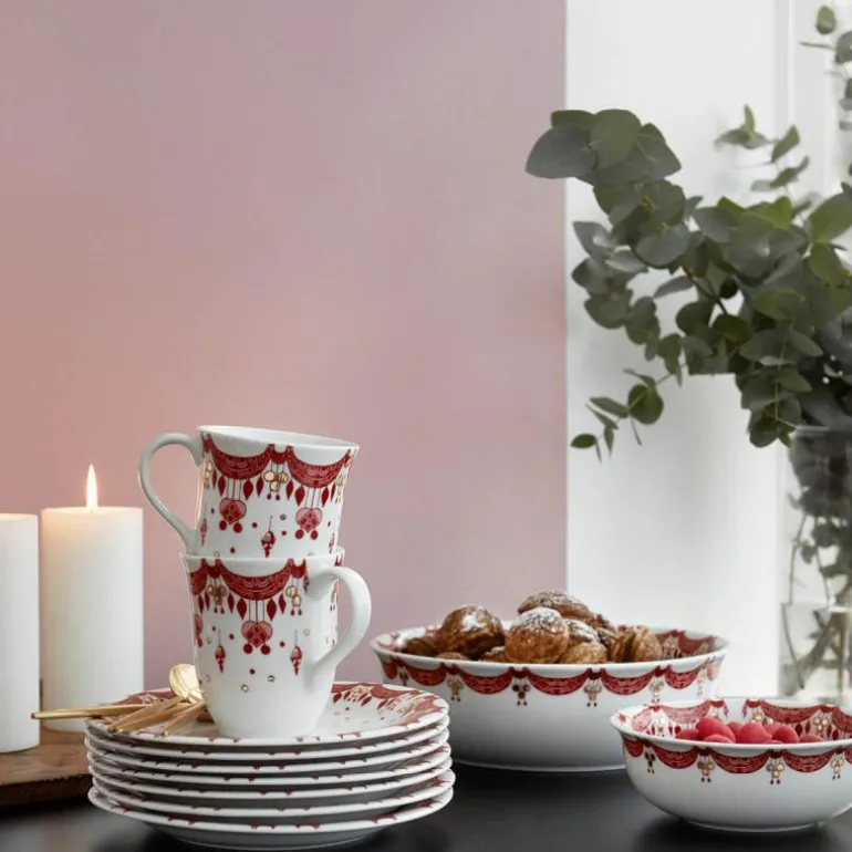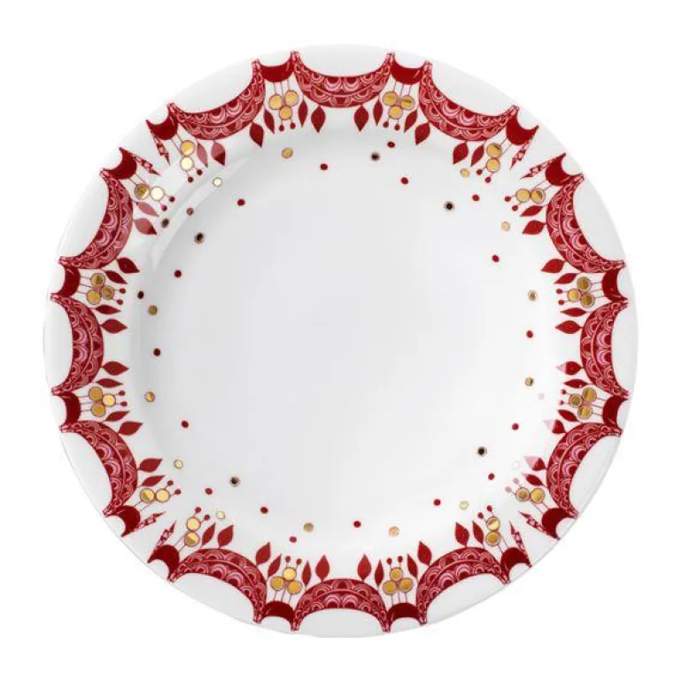 Denne tallerkenen er dekorert med håndapplikerte julemotiver i den klassiske julerøde fargen, og med ekte gull. Dette gjør det enkelt å kombinere den med andre serviser. Den skaper en stemningsfull atmosfære på det åpne kjøkkenet når den ikke er i bruk.