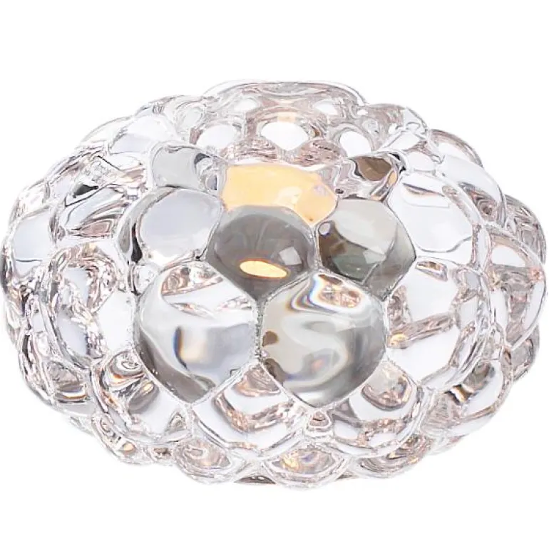 T-lysholder, liten klart glass, dråpeformet design.