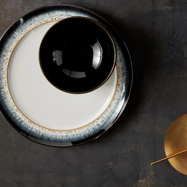 Denbys Halo fremstilles i England av lokal leire. Hver del av Halo er håndlaget med ferdigheter i keramikk som føres videre gjennom generasjoner. To glasurer kombineres for å skape dette unike og effektfulle serviset: Halo. Alle som eier en Denby vet hvor allsidig den er og hvor bra den føles. Hver del er designet for matlaging, servering og å nyte mat. Denbys servise er laget for riktig mat, ikke bare for syns skyld. Dens tilrettelegging for fingre, for spisepinner, for griller, for kjøkkenet ditt – Denby håndterer ting på de aller fleste kjøkkener, fra den minste koppen til den største gryten, og alle våre deler kan trygt brukes i mikrobølgeovn, oppvaskmaskin og fryser. Vi har over 5000 glasurer, alle hardere enn stål. Det har tatt oss 180 år å få glasurene våre så feilfrie som de er. Denby er smashing stuff! Vårt servise er virkelig mye vanskeligere å knekke enn andre serviser. Hver Denby-bit er unik. Den går gjennom 25 par hender før den til slutt havner i dine.