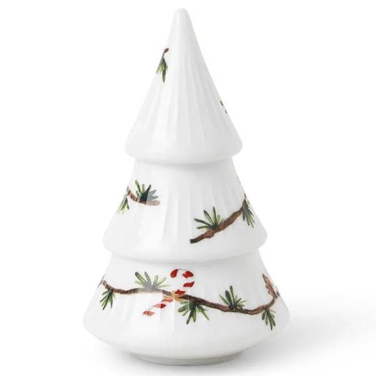 Kählers klassiske hvite Hammershøi-servise har fått et flott jultre! det søte treet er dekorert med nostalgiske jule-elementer, hvor den grønne lerkegrenen skaper en kontinuitet i designet. Hammershøi Juletre ønsker julen velkommen med en samling av de kjente illustrasjoner fra det populære juleserviset. De fine, detaljererte julemotivene er tegnet av kunstneren Rikke Jacobsen, som med sin karakteristiske strek forteller små historier med bl.a. kremmerhus, engler, valnøtter, fugler, kongler og stjerner. Her vises treet i H13 cm