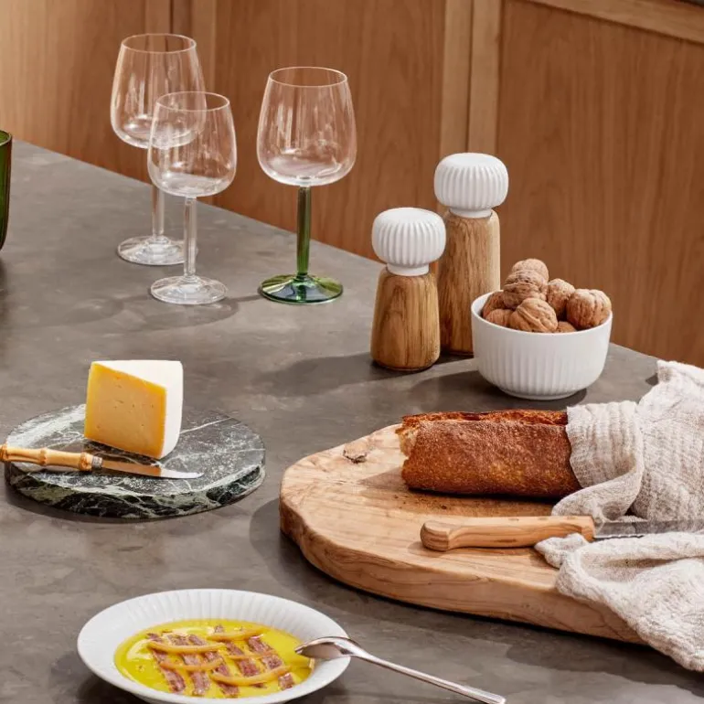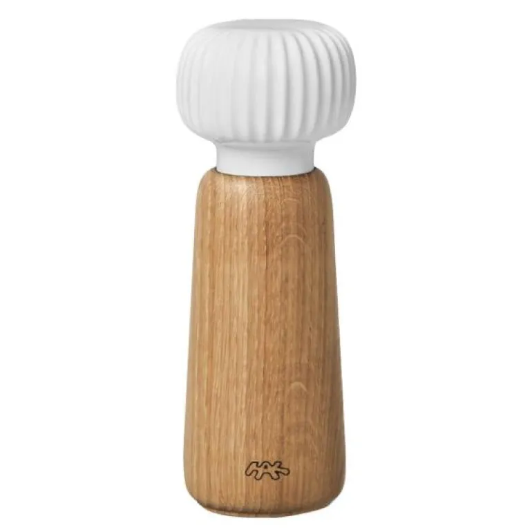 Hvit kvern 18 cm, fra Kählers serie Hammershøi. Den dekorative kvernen fra Kählers Hammershøi-bordservise er et spennende møte mellom de elegante nordiske materialene porselen og tre (eik). Kvernen er utsmykket med et fint og stilfullt hvitt lokk i porselen, som utover det å være en elegant detalj, også har en funksjonell fordel. De nydelige rillene gjør kvernen lett å bruke og fylle med krydder.