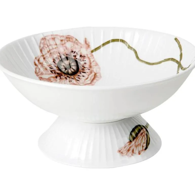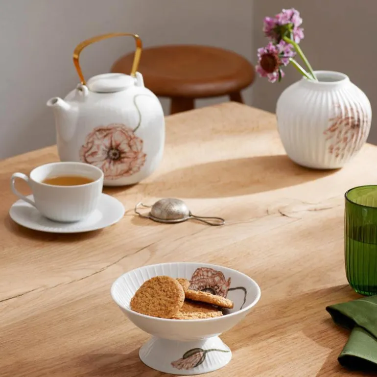 Hammershøi Poppy skål på stett fra Kähler, Ø16 cm hvit m/dekor. Gjør kaken komplett med et vakkert og elegant servise. Disse grasiøse, forsiktig vridde valmuene følger kurvene i porselenet og dukker opp når du minst venter det. Hammershøi Poppy er et moderne blomsterservise inspirert av valmuens fengslende skjønnhet ? virkelig unikt, elegant og feminint. Og med Hammershøi Poppy-kakefatet på 16 cm kan du virkelig omfavne blomstertrenden og virkelig nyte de delikate rosefargede valmuene fulle av liv, bevegelse og femininitet. Kakestativet utstråler sirlig natur og delikat poesi, og de små detaljene utstråler ekte kvalitet og håndverk.