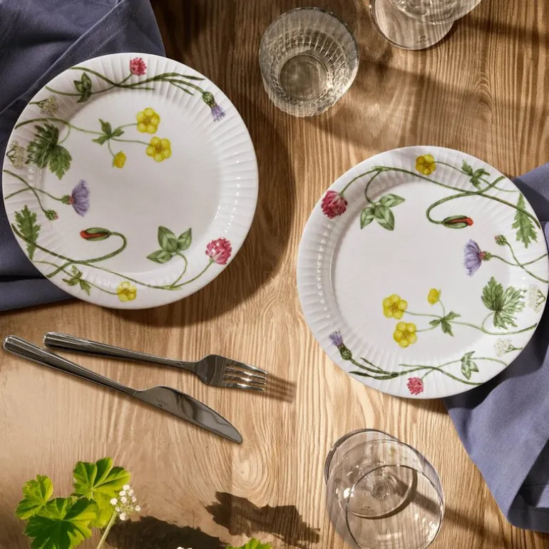De vakre engblomstene, malt i delikate asymmetriske mønstre, ser ut til å danse over de ikoniske Hammershøi-rillene. Dette gir tallerkenen en unik livlighet som er både tidløs og leken. Hammershøi Summer-serien er inspirert av naturens spontane former og farger, og tallerkenen minner oss om å nyte øyeblikkene, akkurat som engblomstene som blomstrer i all sin prakt på markene.