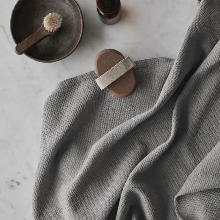 Lekkert, grått badehåndkle i vaffelstruktur, Waffle 70 x 140 cm. Det eksklusive håndkleet fra By mogensen er vaffelvevd i bomull. Håndkleet utmerker seg ved en eksepsjonell tørkeevne, samt en myk og behagelig følelse ved bruk. Med dette håndkleet tilegner du deg hverdagsluksus og velvære, som kombinerer både funksjonalitet og estetikk. Samtidig skapes et tidløst og hjemmekoselig uttrykk på badet.