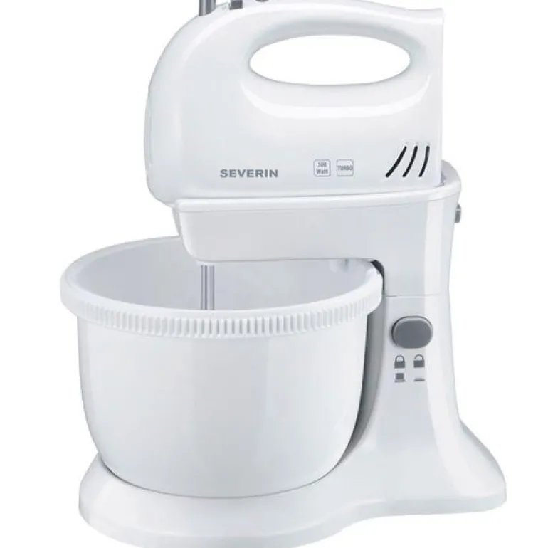Severin HM 3810. Effekt: ca. 300 W. Kapasitet / innhold: ca. 3 liter. Håndmixer med stativ og motordrevet bakebolle. Kraftig håndmixer med 5 hastighetsinnstillinger. Ekstra turbofunksjon. Utløserknapp til røreredskaper. 2 visper, 2 eltekroker. Håndmixer avtagbar. Håndmixerens bakebolle kan vippes i holderen, så den lettere kan tas ut.