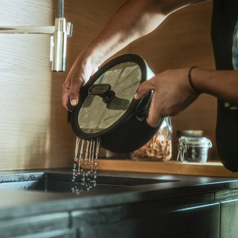 Det varmebestandige glasslokket gir deg full kontroll under matlagingen, og de smarte tømmefunksjonene gjør det enkelt å helle ut væske uten søl. Gryten tåler ovnsbruk opp til 150 °C, mens non-stick-belegget tåler temperaturer opp til 270 °C, noe som gir fleksibilitet til en rekke matlagingsmetoder.