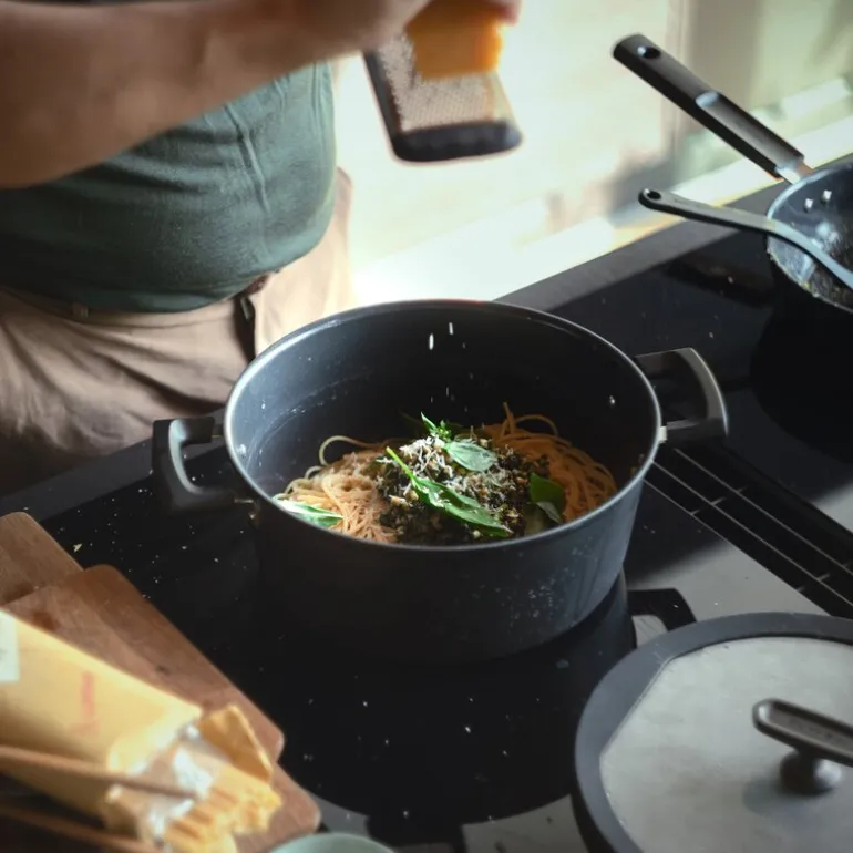 Fiskars Hard Face gryte på 5 liter med lokk er det ideelle valget for større matlagingsprosjekter, enten det er supper, grøt, sauser eller sjy som står på menyen. Med sitt Ceratec™ Superior non-stick-belegg gjør den matlagingen både enkel og effektiv. Belegget sikrer at maten ikke setter seg fast, samtidig som det gir en jevn bruning av ingrediensene, perfekt for alt fra grønnsaker og kjøtt til mer delikate råvarer som fisk og tofu.