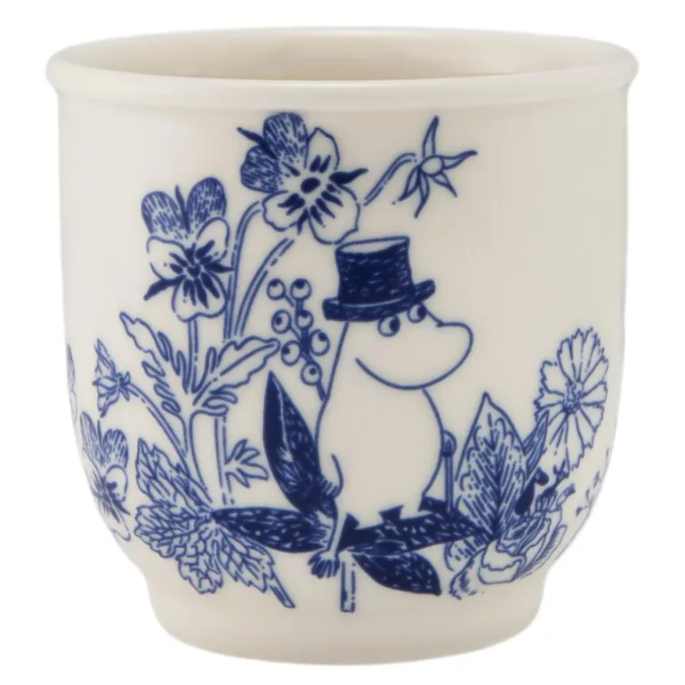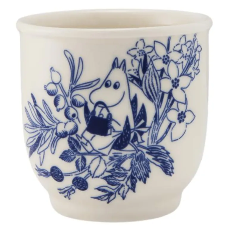 Fin, liten tekopp uten hank 26 cl i hvitt og blått, med motiv av Mummi fra Haru-kolleksjonen til Moomin Arabia. Den harmoniske blå og hvite kolleksjonen er en hyllest til Tove Janssons liv og virke. Designet er inspirert av de myke, taktile formene på den steinete øya Klovharun, hvor Tove bodde om sommeren. Illustrasjonene er inspirert av kranser, som forfatteren selv skapte, og er en hyllest til plantelivet på øya.