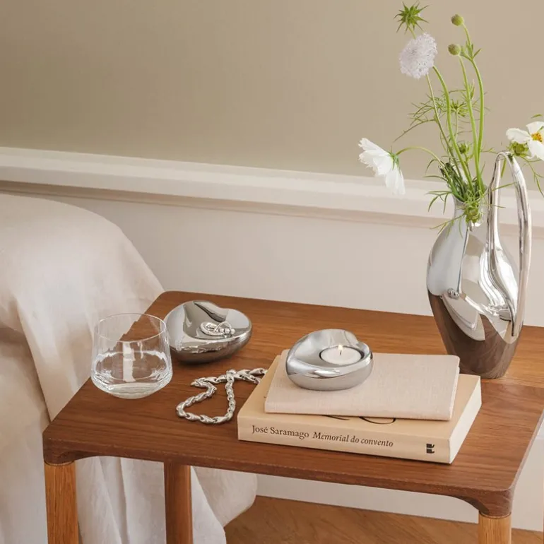 Heart telysholder fra Georg Jensen er en tidløs og romantisk detalj i hjemmet. Med sin hjerteformede design og blanke overflate i rustfritt stål reflekterer den lyset fra telyset på en myk og stemningsfull måte.