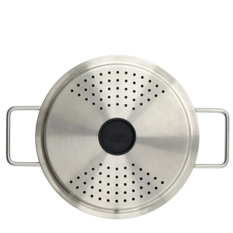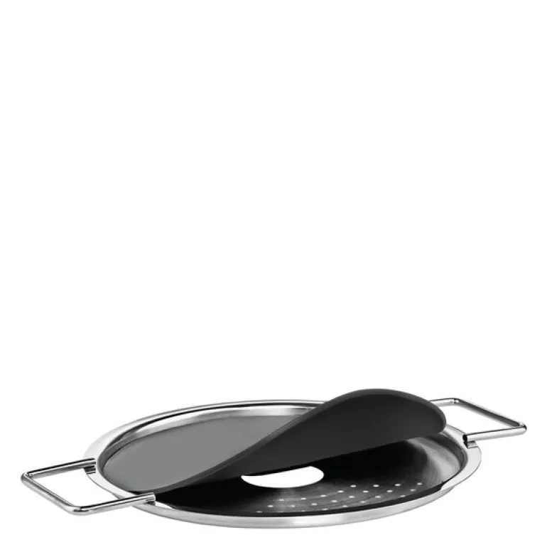 Eva Trio hellelokk 16 cm i svart/stål gir en praktisk måte å helle av væske fra kasseroller på. Den innebygde silen er dekket av en silikonduk som holder varmen og fuktigheten på plass under matlaging. Silikonet løsner automatisk når du heller, slik at vannet renner gjennom uten problemer.
