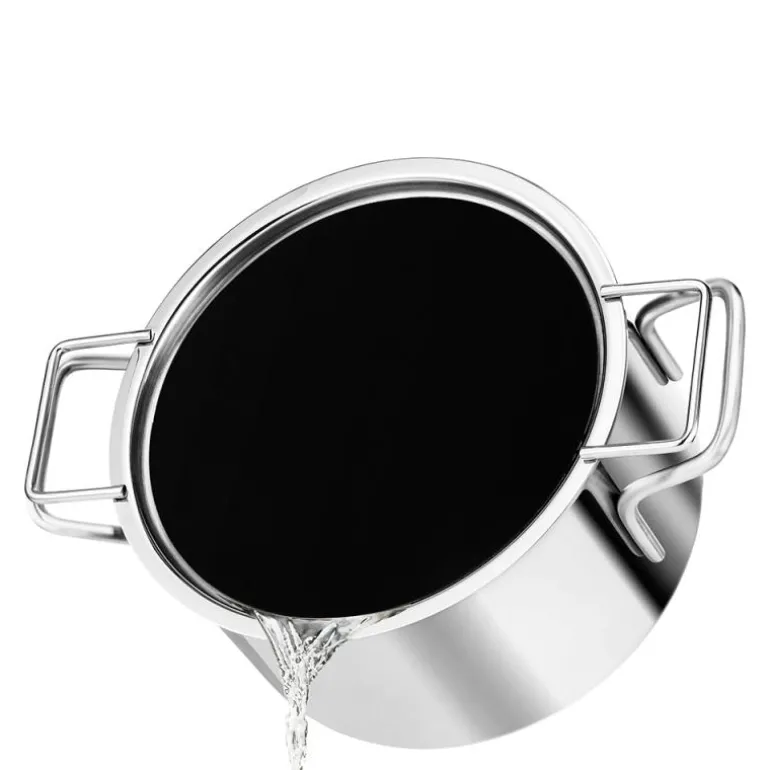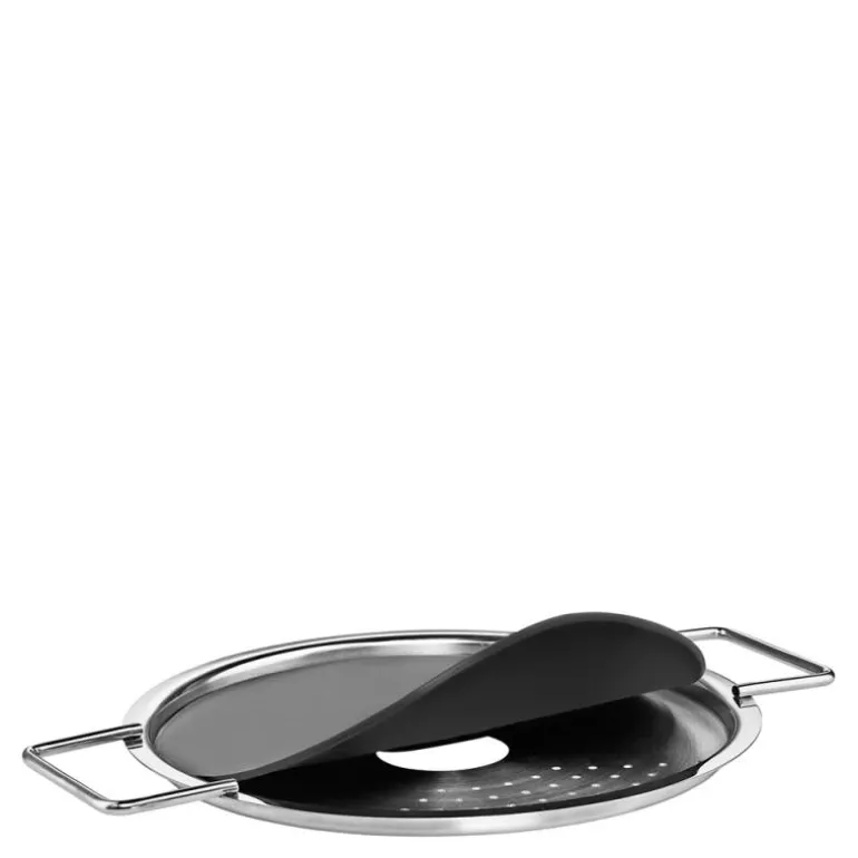 Hellelokket i rustfritt stål har integrert sil som er dekket av en silikontopp. Når du heller, slipper silikonet automatisk lokket slik at vannet kan renne ut gjennom silen.